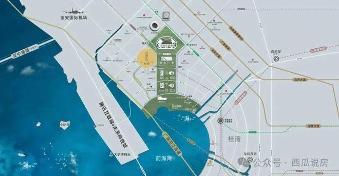 陆:亚州最大交通枢纽——前海综合交通枢纽、妈湾跨海大道、广深沿江高速、深惠城际铁路(在建)、深港西部快轨、深中通道(在建)、滨海大道、穗深城际线、深珠城际线、深茂铁路深圳段