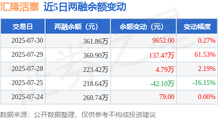 证券之星消息,7月30日,汇隆活塞(833455)融资买入30.47万元,融资偿还29.51万元,融资净买入0.97万元,融资余额361.86万元,近3个交易日已连续净买入累计143.22万元,近20个交易日中有12个交易日出现融资净买入。
