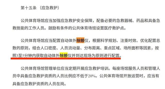 2024年施行的《上海市体育发展条例》已明确规定公共体育场馆应当配备自动体外除颤器(AED)。