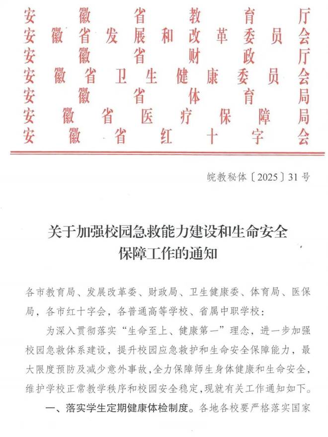 《皖教秘体〔2025〕31号关于加强校园急救能力建设和生命安全保障工作的通知》