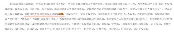 内容:该通知第十五条提出:强化公共安全保障,开展红十字应急救护取证培训7万人,在公共服务窗口、社区医院、中心村卫生室等场所增配AED300台。