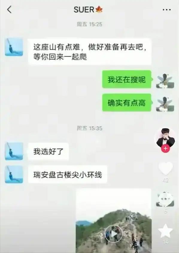 从邱烨峰与朋友的微信对线日下午,他发了几张山景照片,并提醒朋友这座山并不好爬,需要做好准备,等朋友回来后再一起去,还提到了“瑞安盘古楼尖小环线”。