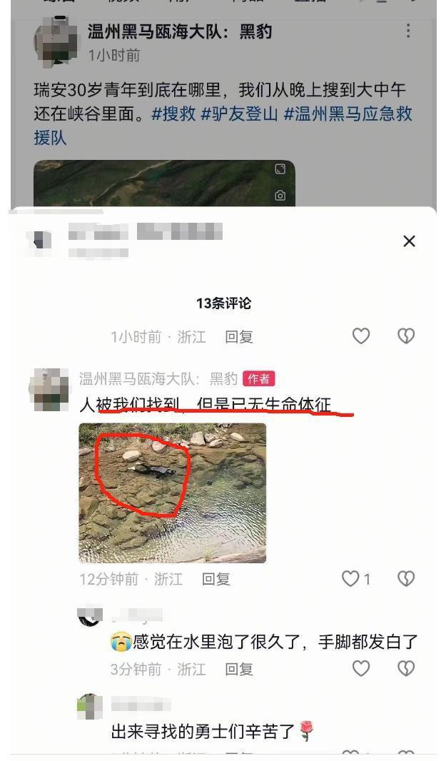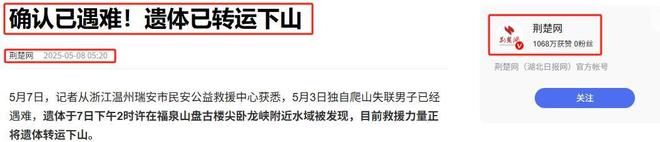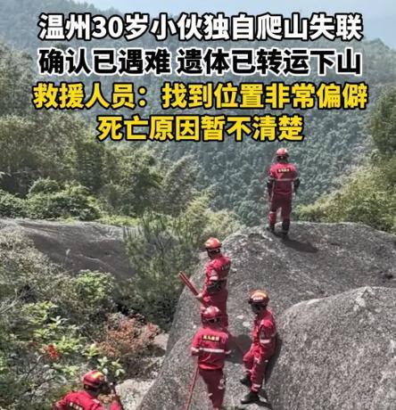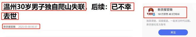 新京报官微,2025-05-08,温州30岁男子独自爬山失联,后续:已不幸去世