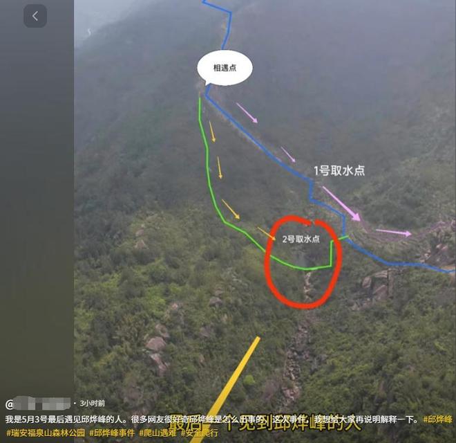 一位热心驴友提供了重要线索:他说曾在山上遇到过一个男人,外貌装束和邱烨峰很像,当时那人只剩下半瓶水了,他还好意提醒对方水可能不够。
